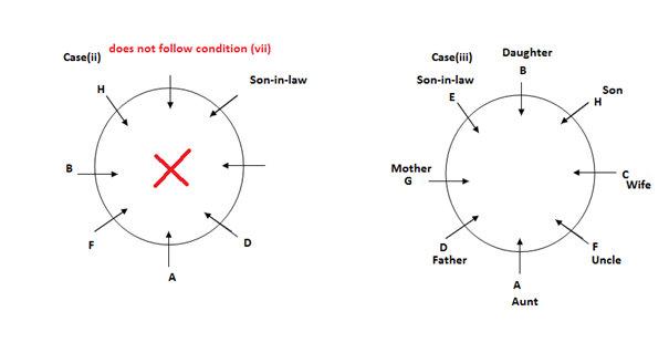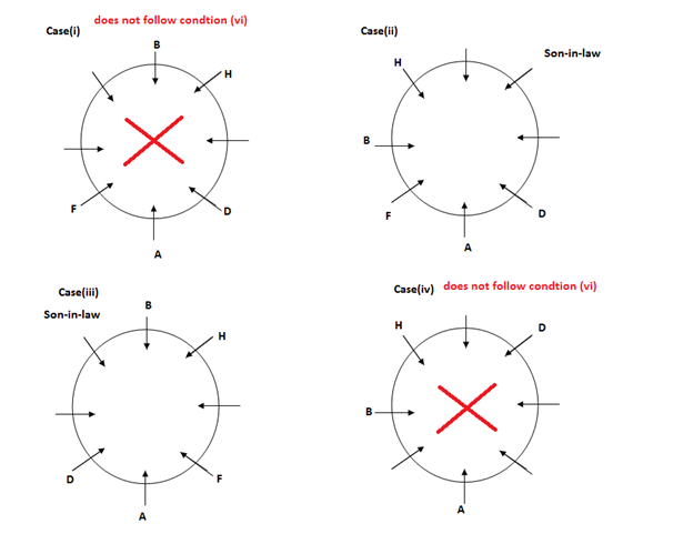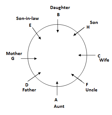 Eight people A, B, C, D, E, F, G and H are sitting in the circular table all faces centre of the circle, but they all not necessary to be in the same order. They all belong to the same family. Each of them is related to Ramu as Mother, Father, Aunt, Uncle, Wife, Son, Daughter and Son-in-law. They are necessary to sit in the same order either in clockwise or in anticlockwise direction.