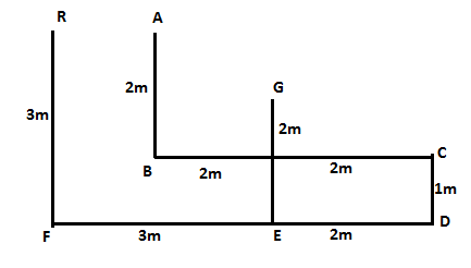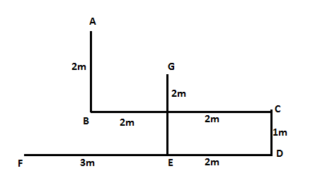 B stands 2m south of A. C stands 1m north of D. E stands 2m west of D. F stands 3m west of E. G stands 2m north of E. C stands 4m east of B.