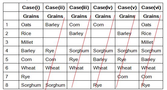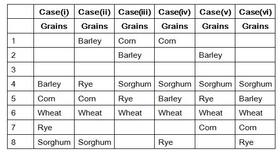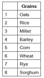 Eight boxes contain eight different kind of grains which are placed one above another. The grains namely Rice, Wheat, Corn, Sorghum, Millet, Oats, Barley and Rye. The topmost box numbered 1 its below box numbered 2 and so on till lowest box numbers 8.