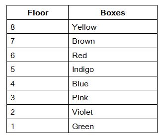 Eight different colour boxes placed one above another. The colours are namely Red, Yellow, Pink, Blue, Green, Violet, Indigo and Brown. The lowermost box numbered 1, its above box numbered 2 and so on till top most box numbered 8. But they are not necessary to be in the same order.