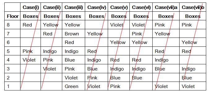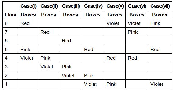 Green colour box is placed at one of the odd numbered floor. Indigo colour box in placed immediately above Blue colour box. Only two boxes are placed between Red and Pink colour boxes. The Red colour box is not places any position below box number 4. Only three boxes are placed between Red and Violet colour box. Brown colour box is not placed immediately below Violet colour box. Yellow box is placed one of the position above Red colour box. Only two boxes is places between Yellow and Indigo colour box. Blue colour box is not placed at lowermost position. More than three boxes are placed between Brown and Green colour boxes.