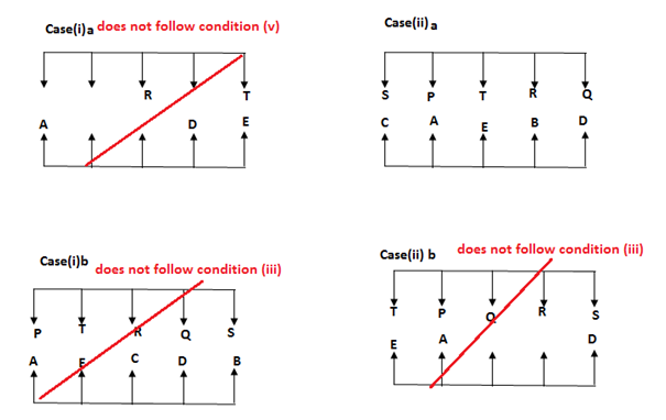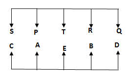 Ten people sitting in the two parallel rows facing each other. In Row I: P, Q, R, S and T are facing south while in Row II: A, B, C, D and E are facing north. But they are not necessary to be in the same order.