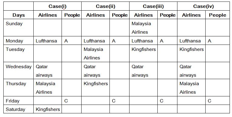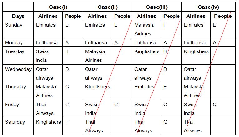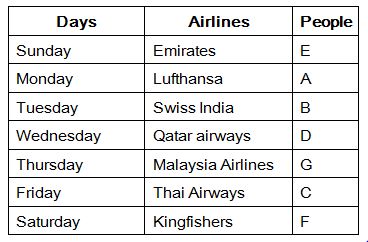 Seven people A, B, C, D, E, F and G like different airlines and they all leaving in seven different days in a week. The airlines are namely Emirates, Thai airways, Malaysia Airlines, Lufthansa, Swiss India, Kingfisher and Qatar airways. The week days starts from Sunday to Saturday.  All the given information is not necessary to be in the same order.