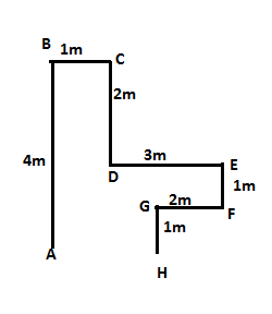 A stands 4m south of B, who stands 1m west of C. G stands 1m north of H. E stands 3m east of D. C stands 2m north of D. G stands 2m west of F. E stands 1m north of F.