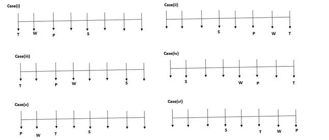 i) Only one person sits between T and P, either of them sits at extreme end of the line.