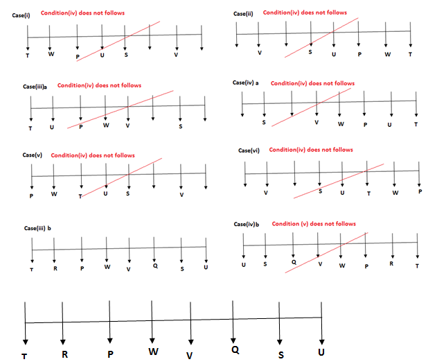 Eight people P, Q, R, S, T, U, V, and W are sitting in a linear table and all of them are facing south. They all not necessary to be in the same order. Only two person sits between S and W, who is an immediate neighbour of P. Only one person sits between T and P, either of them sits at extreme end of the line.Only two people sits between U and V, who is neither an immediate neighbour of S nor P. More than two people sit between R and Q, who is not an immediate neighbour of P.R does not sits to the left of Q.