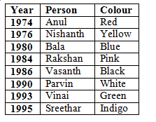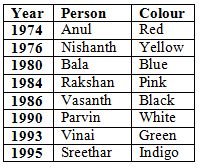 Eight people Anul, Bala, Vinai, Rakshan, Pravin, Nishanth, Sreethar and Vasanth. Are born in different years viz, 1974, 1976, 1980, 1984, 1986, 1990, 1993 and 1995. They all like different colours namely Red, Blue, Green, Pink, White, Black, Indigo and Yellow. All the information is not necessary to be in the same order.Calculation is done with respect to the present year 2018 and assuming months and date to be same.