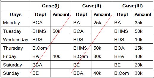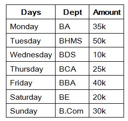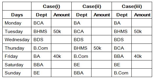 Seven different departments in the institution is organising functions, namely BDS, BA, BCA, BBA, B.Com, BHMS and BE.Each of them spend different amount in seven different days in the week to organize a function. Viz,. 10k, 20k, 25k, 30k, 35k, 40k and 50k. The week days are started from Monday to Sunday. All the given information is not necessary to be in the same order.