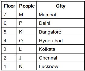 Seven people J, K, L, M, N, O and P are living in seven different floors in a building. The lowermost floor numbered one its above floor numbered two and so on till top most floor numbered seven. Each one of them is from seven different cities in India namely, Chennai, Bangalore, Hyderabad, Kolkata, Lucknow, Delhi and Mumbai. All the given information is not necessary to be in the same order.