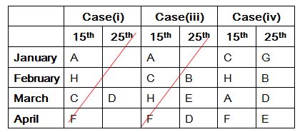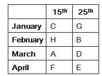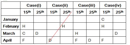 Eight people A, B, C, D, E, F, G and H are born in four different months in the same year . All of them are born either on 15th or 25th of the months viz January, Feburary, March and April. Only two people are born between D and H, who born one of the month before Dand was not born on the first month of the year. F is born on 15th April. Only one person born between H and C. E and B are not born in same month. A is not born on 25th of any of the months. E is younger to A. G is not younger to A.B and C are not born on same month.