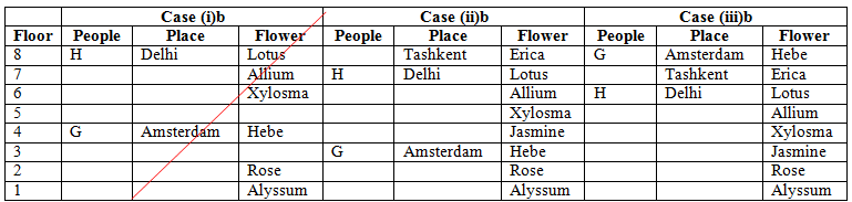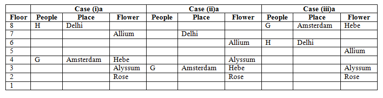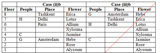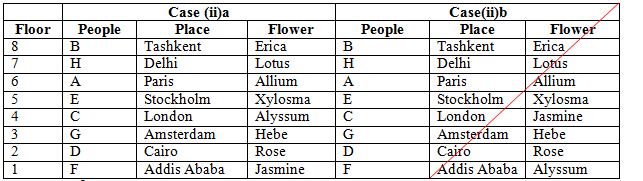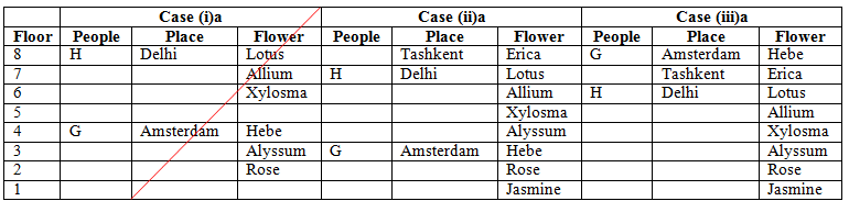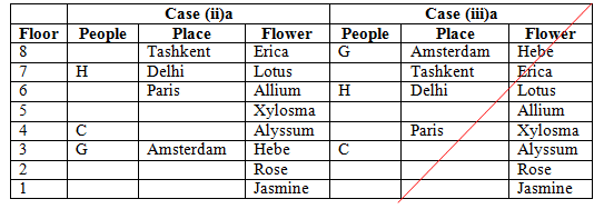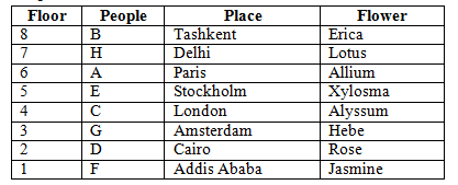 Eight people A, B, C, D, E, F, G and H are from eight different places and they all likes different flowers. They all living in eight different floors in a apartment, The lowermost floor numbered one, its above floor numbered two, and so on till top most floor numbered 8. The places are namely Delhi, Tashkent, Amsterdam, Paris, Addis Ababa, Cairo, Stockholm and London. Each of them likes different flowers namely Rose, Jasmine, Xylosma, Allium, Erica, Lotus, Hebe and Alyssum. All the information is not necessary to be in the same order.