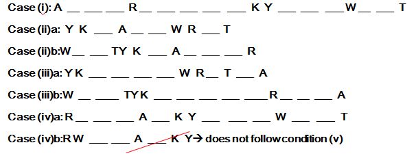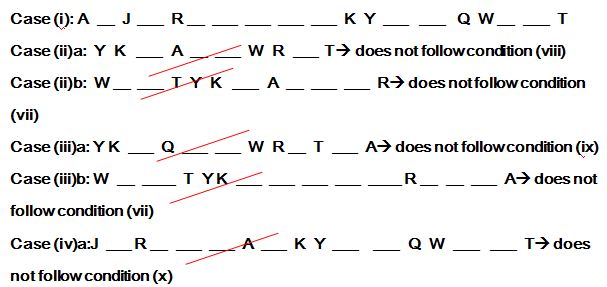 A certain number of people sitting in the linear row facing north. Only three people sit between A and R. Only four people sit between K and W. Only five people sit between R and K. T sits third to the right of W. Only six people sit between R and Y. Not more than three people sit between K and Y. More than four people sit between T and Y. Q sits third to the right of Y. None of them sits between Q and W. J sits eighth to the left of K. Not more than three persons sit between A and J.