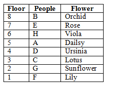 Eight people A, B, C, D, E, F, G and H are living in eight different floors in a building. Each of them likes eight different flowers. The floors are namely Dailsy, Sunflower, Lotus, Rose, Viola, Orchid, Ursinia and Lily. All the information are not necessary to be in the same order.