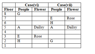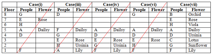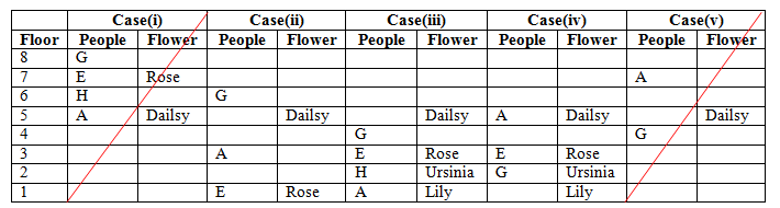 G does not likes Viola. The person who lives in floor number 5 likes Dailsy floor. E likes Rose. G lives in even numbered floor. The person who likes Lily lives one of the floor below the person who likes Ursinia.Only two people lives between G and A. Only one people lives between A and E, who lives immediately above H.The person who likes Ursinia lives one of the floor below the person who likes Rose.D lives one of the floor above F. Only two people lives between D and F, who does not likes Dailsy flower. B and C does not lives consecutive floors. C lives in odd numbered floor. Only three people lives between the person who likes Lily and the person who likes Dailsy. Neither G nor C likes Ursinia. The person who likes Orchid lives one of the floor above the person who likes Rose. H likes either Viola or Sunflower. G does not likes Lotus.