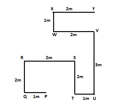 P stands 1m east of Q. R stands 2m west of S. W stands 2m west of V. Y stands 2m east of X. T stands 1m west of U. R stands 2m north of Q. S stands 2m north of T.V stands 3m north of U. W stands 1m south of X.