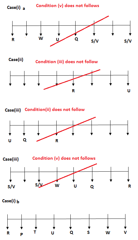 i) Only two people sits between R and U, either of them sits at extreme end of the row.