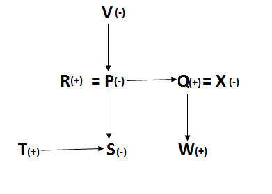 P is daughter of V, who is grandmother of W. X is daughter-in-law of V, who has only one daughter. V has two children. P is mother of T and S, who is the only daughter of R. W is the son of Q.