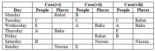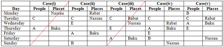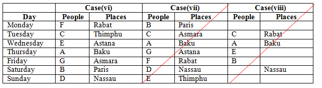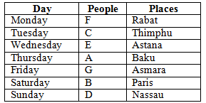 Seven people A, B, C, D, E, F and G are going to tour forseven different places in seven different days in the week. The week days started from Monday to Sunday. The places are namely Baku, Rabat,Nassau, Astana, Thimphu, Paris and Asmara. All the information is not necessary to be in the same order.