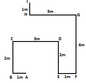 A stands 1m east of B. E stands 1m west of F. I stands 1m north of H. C stands 3m west of D. D stands 2m north of E. B stands 2m south of C. G stands 4m north of F and 3m east of H.