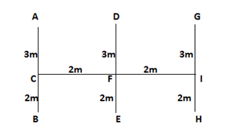 A stands 3 meter North of C, who stands 2 meter north of B. F stands 2 meter east of C and stands 2 meter west of I. H stands 2 meter east of E, who stands 2 meter south of F. D stands 2 meter west of G, who stands 3 meter north of I.