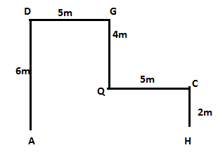 A stands 6 meter south of D, who stands 5 meter west of G. G stands 4 meter north of Q, who stands 5 meter west of C. C stands 2 meter north of H.