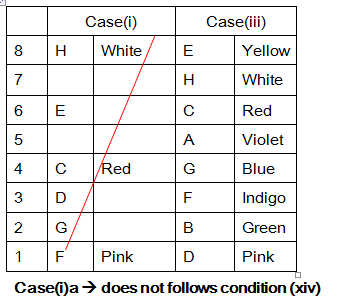A, B, C, D, E, F, G and H are the eight persons lives in eight different floors. They all likes different colours namely, Red, Blue, Green, Yellow, Pink, White, Indigo and Violet. But they all not necessary to be in the same order. The Ground floor numbered one, its above floor numbered two and so on till top most floor numbered eight.