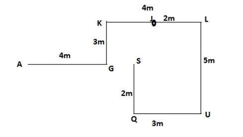 A stands 4 meter West of G, Who stands 3 meter south of K. J stands 2 meter west of L, who stands 4 meter East of K. U stands 5 meter south of L and stands 3 meter East of Q. S stands 2 meter north of Q.