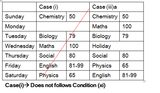 Only three days are between the distribution of Chemistry paper Social paper. Half of the persons where failed in Chemistry while comparing to Maths. The pass percentage in English was less than Maths, but greater than Social. Biology’s pass percentage was Twenty-one percentage less than Maths percentage. English paper was distributed one of the day after social paper. All the students in the class were passed in maths. Only three papers where distributed before the Subject which pass percentage has one more than Biology percentage . Only two papers where distributed between Physics and Maths. Maths paper was neither distributed on Friday nor on Tuesday. Tuesday was not a holiday. Not less than one day gap between the distribution of Chemistry and the subject which has pass percentage of Seventy nine. Physics pass percentage was fifteen more than Chemistry’s pass percentage. The paper with less pass percentage than English was not distributed after English paper. Social paper was not distributed before Chemistry paper. Maths paper will not be distributed after Holiday.