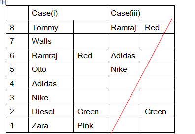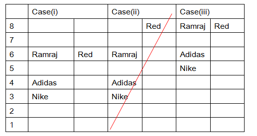 iii). Only two person lives between the person who likes Nike and the person who likes Ramraj, either of them likes Red colour.