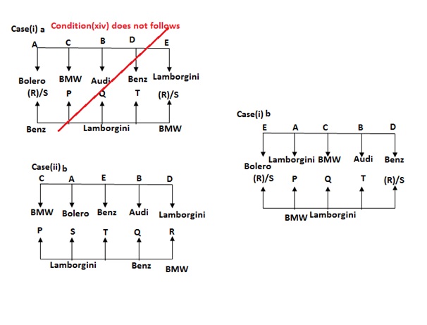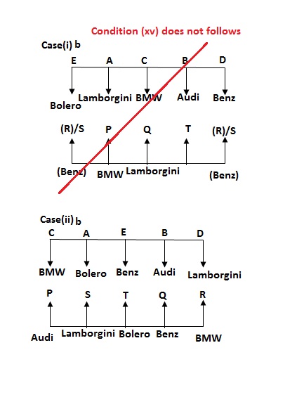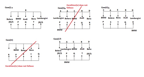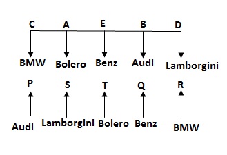 A, B, C, D and E are the five persons facing south while P, Q, R, S and T are the five persons facing north.Each person in the row faces the person in opposite row but not necessarily in the above given order. They have five varieties of cars namely BMW, Benz, Audi, Bolero and Lamborghini. Only one person in each row has one variety of car. No two persons having same cars faces each other.