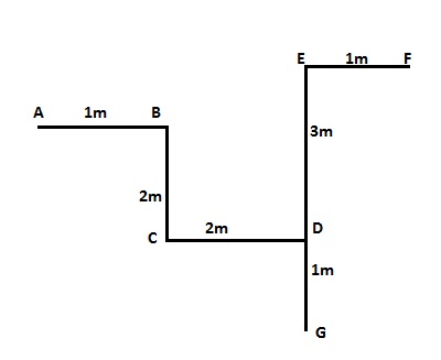 A stands 1 meter west of B, who stands 2 meter north of C. E stands 3 meter North of D, who stands 2 meter East of C. F stands 1 meter East of E. G stands 1 meter south of D.
