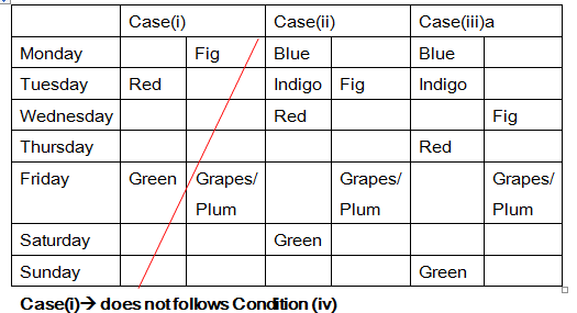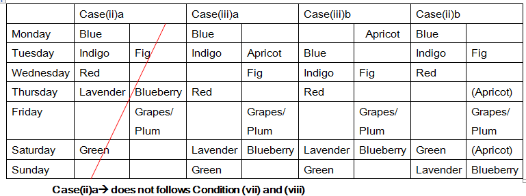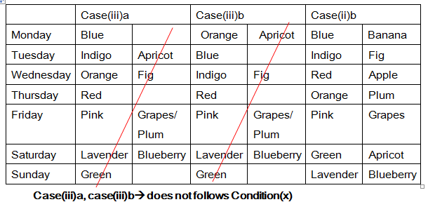 Amirtha will eat blueberry, when she wear’s lavender dress. On Friday Amirtha eats either Grapes or Plum. Amirtha eats Fig immediately before she wear’s Red colour dress. There were two days gap between Amirtha wearing Red colour and Green colour dresses. She wear’s Blue colour dress immediately before the day when she wears Indigo dress. Amirtha neither eats Grapes nor Plum while wearing Blue and Indigo colour dresses. Apricot was had by Amirtha one of the day before Blueberry. Amirtha will not wear green colour dress before Thursday. Amirtha won’t take Fig on first day of the week. Amirtha will not take Apricot, while wearing Red or Blue colour dresses. There where one day gap between Blueberry and Grapes. Amirtha does not wear Orange colour dress on Friday. Amirtha will not have Apricot any day before wearing Pink Colour dress. More than two days gap between Amirtha wearing Pink colour dress and having Banana. Amirtha had Plum one of the day after wearing Red colour dress.