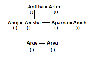 There are eight persons in the family. There are three married couples in the family. Anitha is the mother-in-law of Anuj, whose sister-in-law was Aparna. Arav was son of Anisha and Nephew of Anish. Arun was father of Aparna. Arya was the son of Anuj. Anish was not a female. Anish’s sister-in-law was Anisha. Anisha is the sister of Aparna. Anuj and Anish are not brothers.