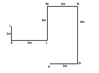 J stands 1 meter to the north of K, who stands 2 meters west of L. P stands 2 meters to the west of O, who stands 4 meter south of N. M stands 3 meter north of L. M stands 2 meter west of N.