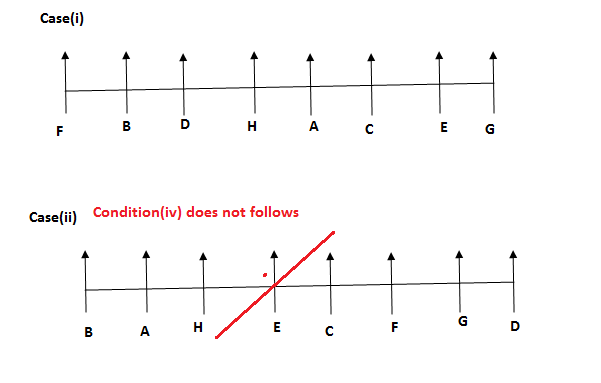 Eight persons A, B, C, D, E, F, G and H are sitting in the linear table and all are facing north but they all not necessary to be in the same order.