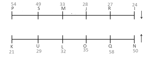 Twelve persons are sitting in a two parallel row, Row 1 and Row 2.  I, J, S, M, R, and P are sitting in row 1 facing south. O, K, N, L, Q and U are sitting in row 2 facing north. Each of them has different age 54, 29, 35, 24, 27, 49, 58, 33, 32, 28, 21 and 50 but not necessarily in the same order.