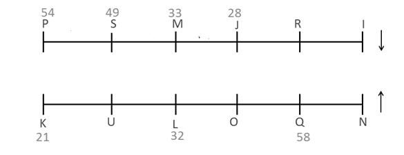J and L are 28 years and 32 years old respectively and the persons sit left of J and L are younger to them and the person sits right of J and L are elder to them. I is younger than J and two persons are sitting between I and the one whose age is 33. Q sits second to the right of L who sits opposite to the one whose age is multiple of 11.K is youngest person and sits at the extreme end of the row. Only two people are younger to L in his row. K sits opposite to the one who is the second eldest person. Two people sit between S and R who sits opposite to the one whose age is 58 years. M doesn’t sit opposite to K. The age of S is square of an odd number. At least two people sits between N and U who doesn’t sit at the extreme end of the row. R is younger than U but elder than I. N’s age is not a multiple of 7.