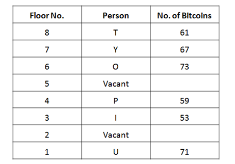 There are six people- P, O, I, U, Y and T lives in different floors of an eight-storey building but not necessarily in same order. Lowermost floor of building is numbered 1, one above that is numbered 2 and so on. Each has different number of Bitcoins which is a prime number between 50 and 75.