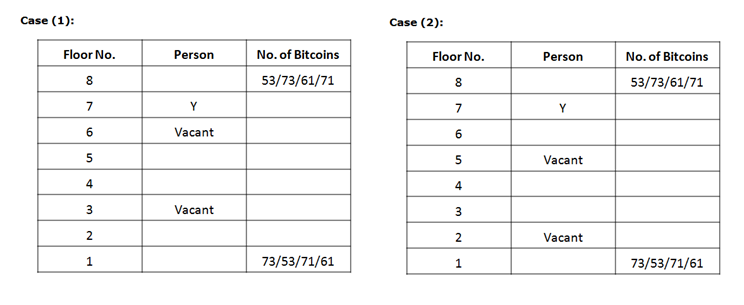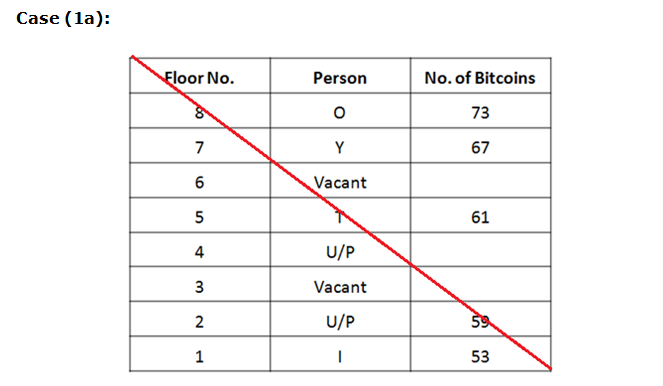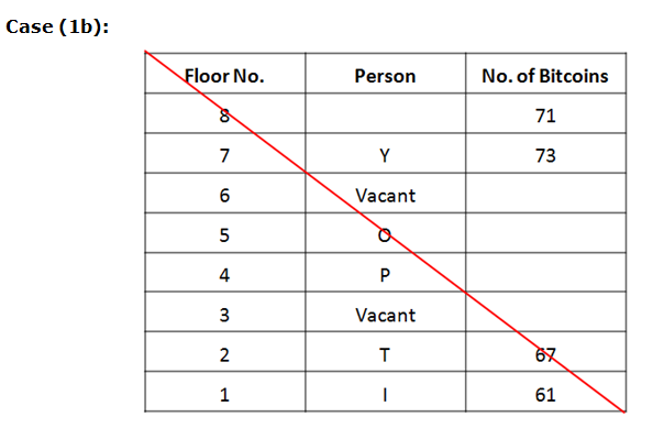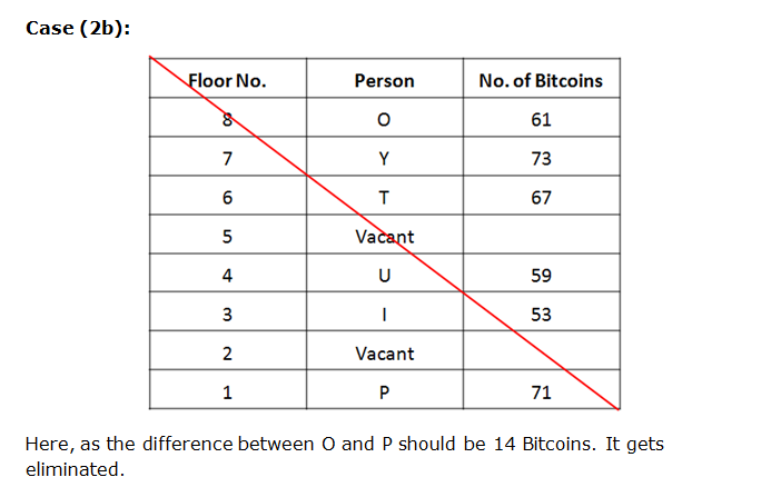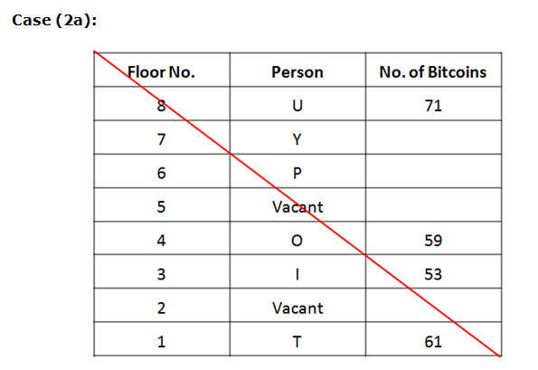 In Case (2a), we take the person with 61 Bitcoins at first floor and as I have 53 Bitcoins. As U live at one of the floors below T. It gets eliminated. So, we can fix that T won’t live at floor numbered 1.