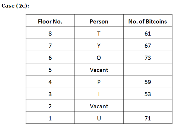 Only one person lives between O and T. O lives in even numbered floor but not 2. The number of people living in floors above O is as same as the number of people living in floors below P and the difference between their Bitcoins is 14.