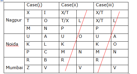 Eight persons P, K, X, Z, M, U, T and R are from three different cities namely, Mumbai, Noida and Nagpur. All the eight persons are working in eight different companies viz., N, O, I, L, B, V, A and C. All the information is not necessary to be in the same order. Not more than three persons are from same city.