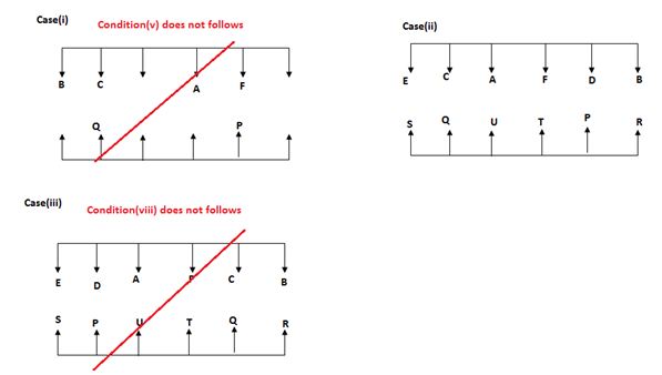Twelve people are sitting in a two rows facing each other. In row-1 A, B, C, D, E and F are sitting and facing south. While in row-2 P, Q, R, S, T and U are sitting and facing north. They all are not necessary to be in the same order.