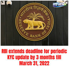 - The Reserve Bank of India (RBI) has extended the last date for KYC updation for bank accounts by three months to March 31 2022.