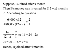 - A invests Rs. 64,000 in a business. After few months B joined him with Rs. 48,000. At the end of year, the total profit was divided between them in the ratio 2: 1. After how many months did B join?