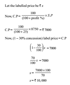 - A got 30% concession on the label price of an article sold for Rs. 8,750 with 25% profit on the price he bought. The label price was