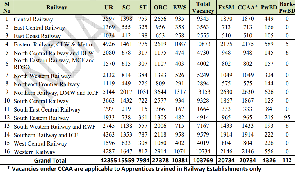 - The vacancies to be filled from among the Course Completed Act Apprentices (CCAAs) trained in Railway Establishments and possessing National Apprenticeship Certificate (NAC) granted by National Council of Vocational Training (NCVT) is separately indicated in the vacancy table.
