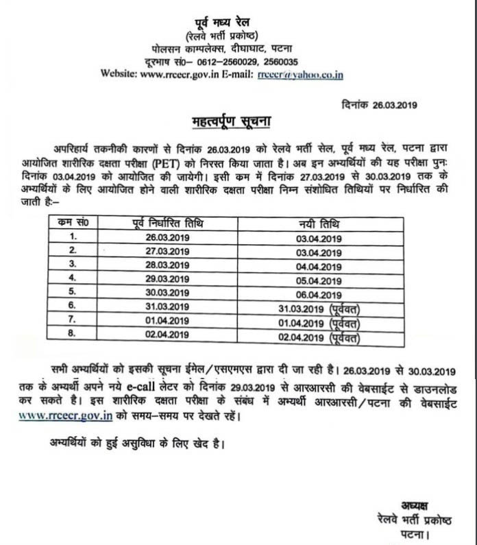 RRB PET Exam Rescheduled: Railway Recruitment Board is inviting the application form from the aspirants for the Group D Vacancies. Applicants who are qualified in the RRB Group D Computer Based Written Exam are eligible to appear for the RRB PET Exam Rescheduled. Now, the RRB PET Exam Rescheduled for the Patna Region. All the RRB PET Exams likely to be from 26th March 2019 to 30th March 2019 are rescheduled to 03rd April 2019 to 06th April 2019. Further, all the applicants can utilize this great opportunity to hold a career in the RRB. Also, the Admit Card for the RRB PET Exam Rescheduled date admit card will avail from 29th March 2019. Likewise, the rescheduled RRB PET Exam Reschedule will help the aspirants practise a lot to hold a career in Central Government sector. To know further information about the RRB PET Exam Rescheduled Date, aspirants can check the official notice from the below link.