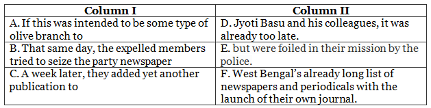 joins with D, B with E and C joins with F to make correct sentences. D talks about who the olive branch was intended for and what was the outcome, thus completing sentence A. E talks about the fate of the attempt to seize the party newspaper described in B, thus completing the latter. F talks about how the new publication announced (in C) joins the already lengthy list of newspapers and periodicals in Bengal, thus completing sentence C.