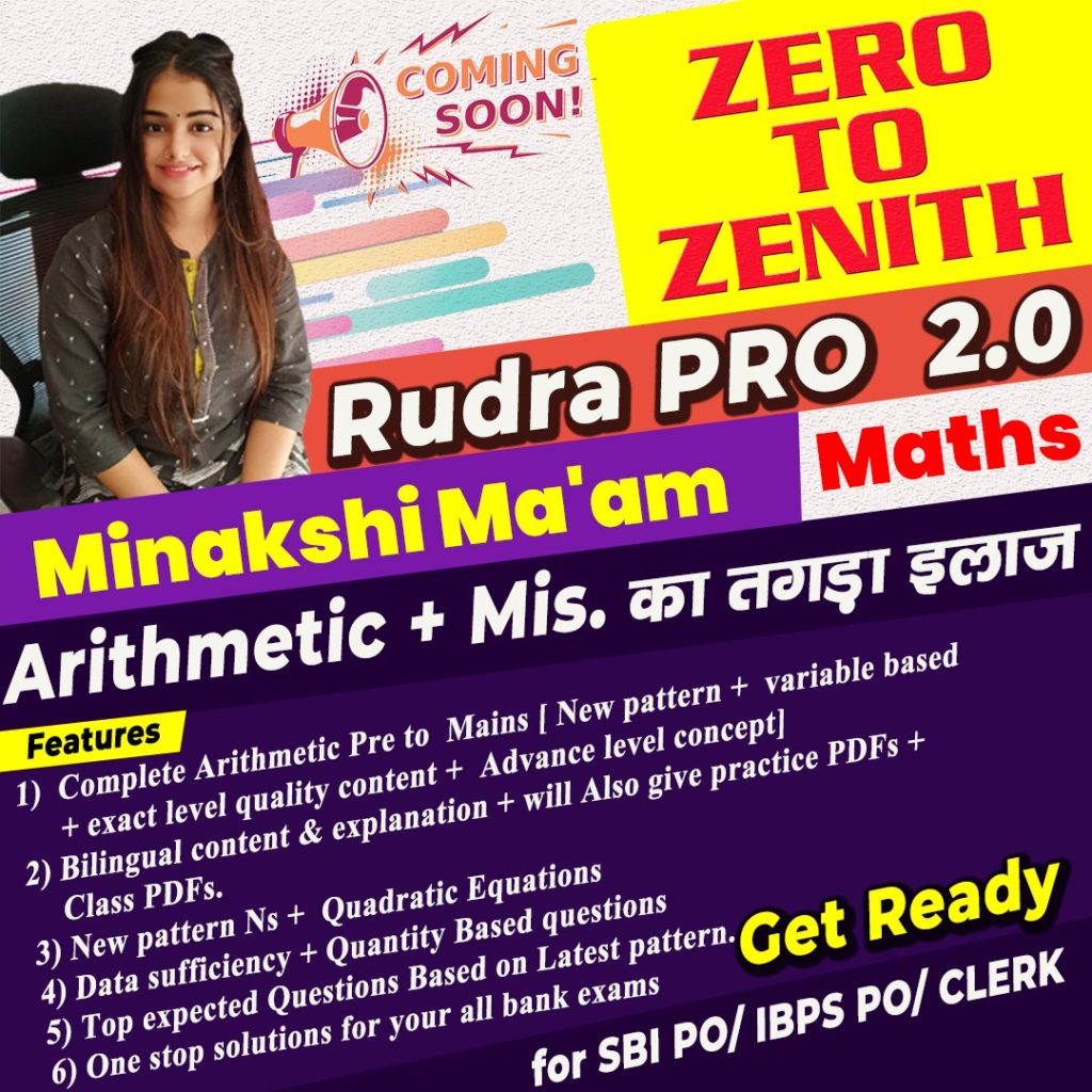 Hi Aspirants, Very soon, a surprising video course package is going to be launched. Yes!!! It is Rudra PRO 2.0 Zero to Zenith Video Course by Minakshi Ma’am. This is specially made for Arithmetic and miscellaneous problems. Aspirants preparing for banking exams can utilize this package to maximize their performance levels in the upcoming exams.