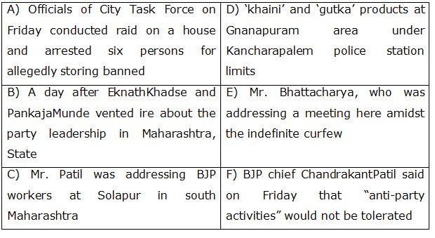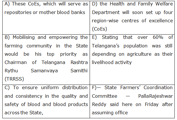 Direction (6-10): In the following questions two columns are given containing three Sentences/phrases each. In first column, sentences/phrases are A, B and C and in the second column the sentences/phrases are D, E and F. A sentence/phrase from the first column may or may not connect with another sentence/phrase from the second column to make a grammatically and contextually correct sentence. Each question has five options, four of which display the sequence(s) in which the sentences/phrases can be joined to form a grammatically and contextually correct sentence. If none of the options given forms a correct sentence after combination, mark (e), i.e. “None of these” as your answer.